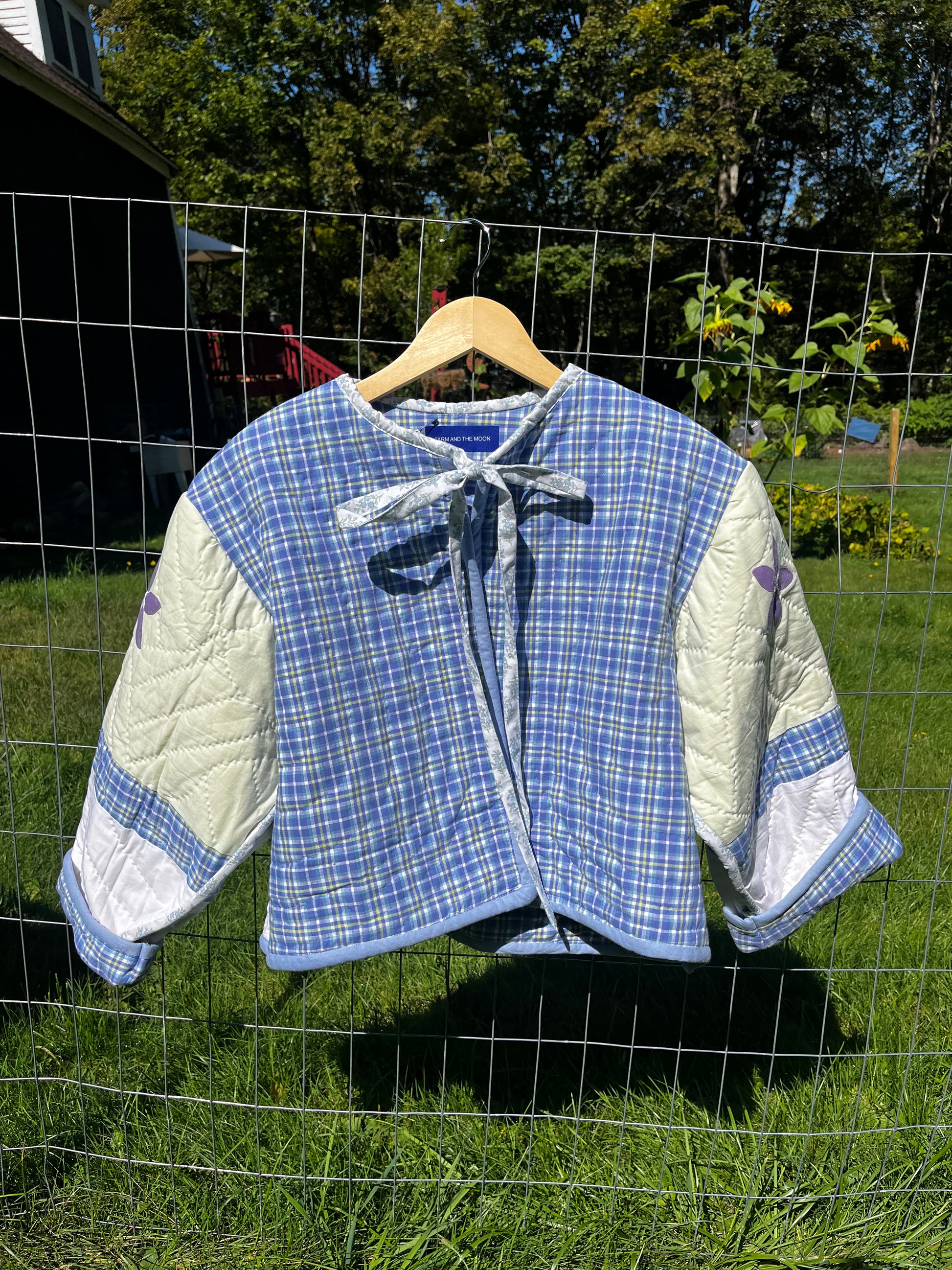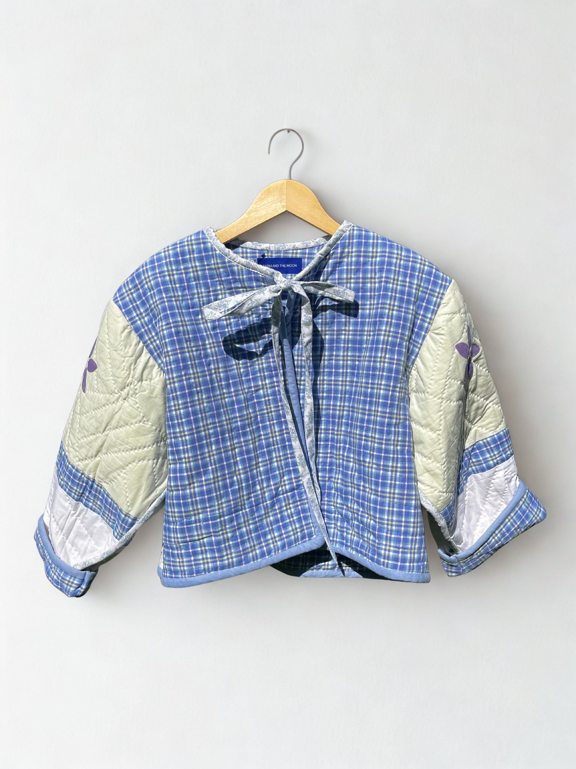 The Blue Flower Applique Quilt Coat features a cropped silhouette with an adjustable front tie closure. This jacket offers lightweight warmth and artistic detail, making it an elegant choice for layering in cooler weather.