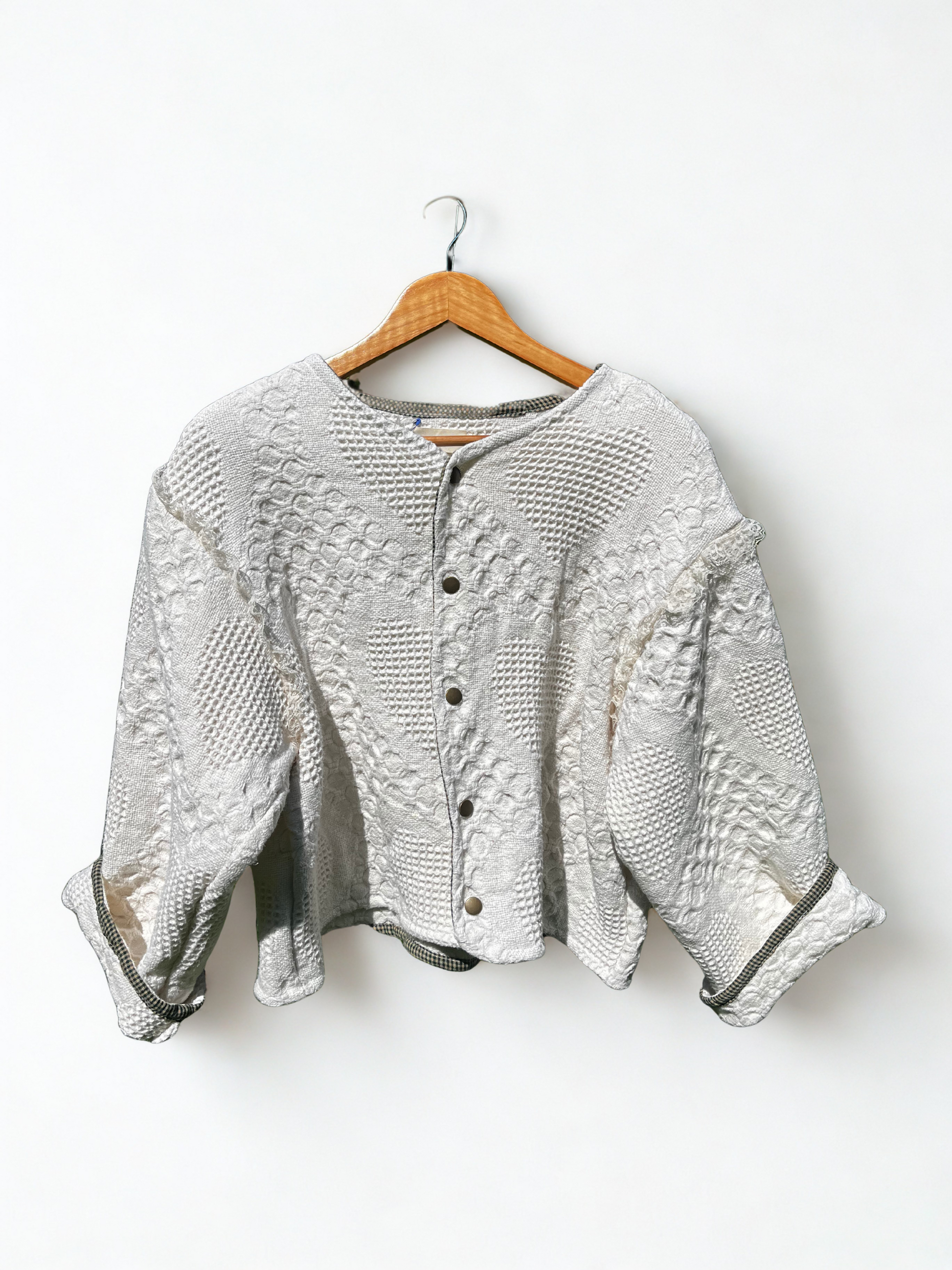 The Sweet Heart Jacket is a lightweight blanket jacket with snap closures and a cropped style. It features a heart pattern and green gingham throughout the jacket.